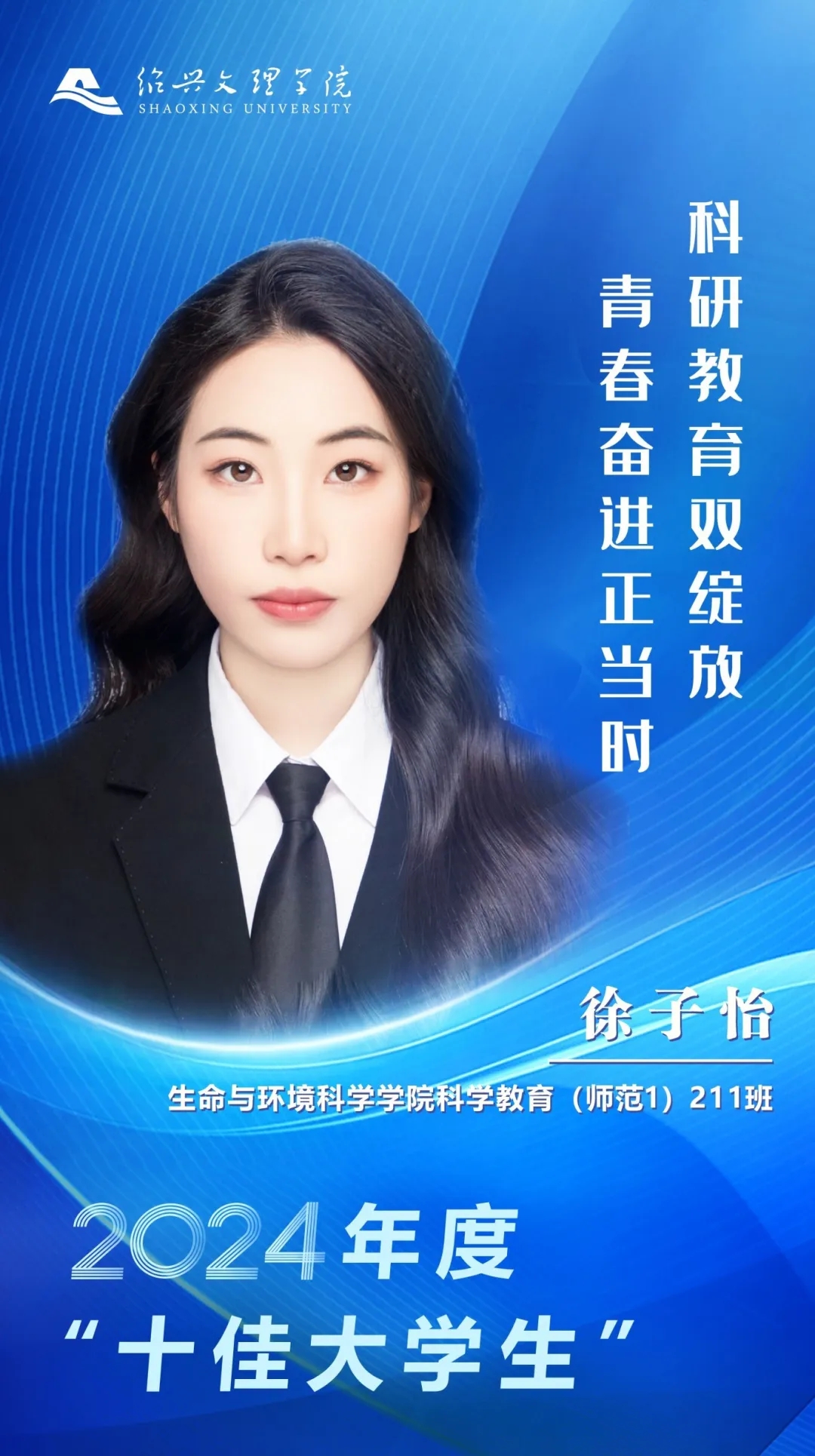 她笃学不倦,热爱作舟。大学期间,她求是创新,以一作发表SCI论文2篇,其中,高被引论文1篇,主持国家级、省级学生科研项目2项;她坚持理论与实践相结合,志存高远,脚踏实地的参加各类学科竞赛,斩获国家级奖项4项,省部级6项。她积极投身于社会实践和志愿服务,将特色实验课程带入中小学双减课堂,探索科学奥秘,启发教育本真,连续两年获得校优秀志愿者称号,公益时长累计360小时。四年来,她在青春赛道上奋力奔跑,在初心梦想里传承科教力量。