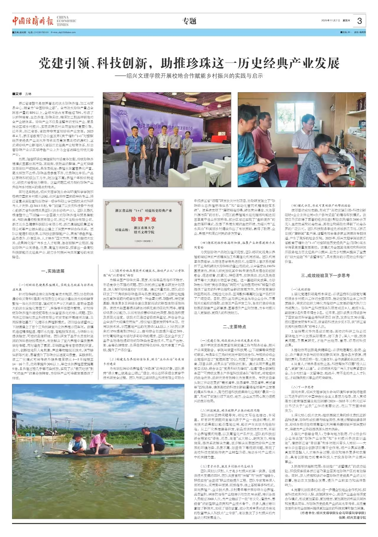 11月7日,《中国经济时报》第3版以“党建引领、科技创新,助推珍珠这一历史经典产业发展”为题,专题报道我院开展校地合作赋能乡村振兴工作。全文如下: